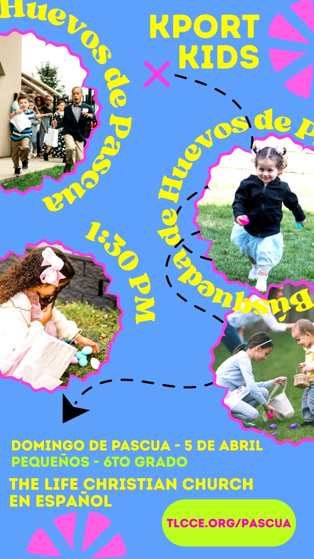 Detalles del event: Eggstravaganza se llevará a cabo durante el servicio de Pascua (1:30PM), no antes ni después. Este evento es gratuito y está abierto para niños desde pequeños hasta 6to grado — no se requiere membresía de TLCC! Solo regístrate all llegar en el área del ministerio KPort Kids.